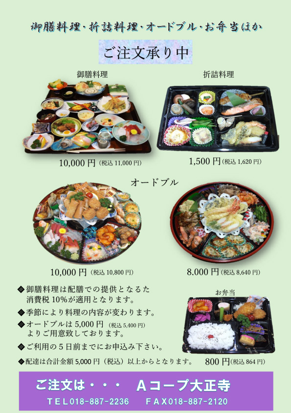 Aコープ大正寺では、御膳料理・折詰料理・オードブル・お弁当ほか、ご注文を承っております。